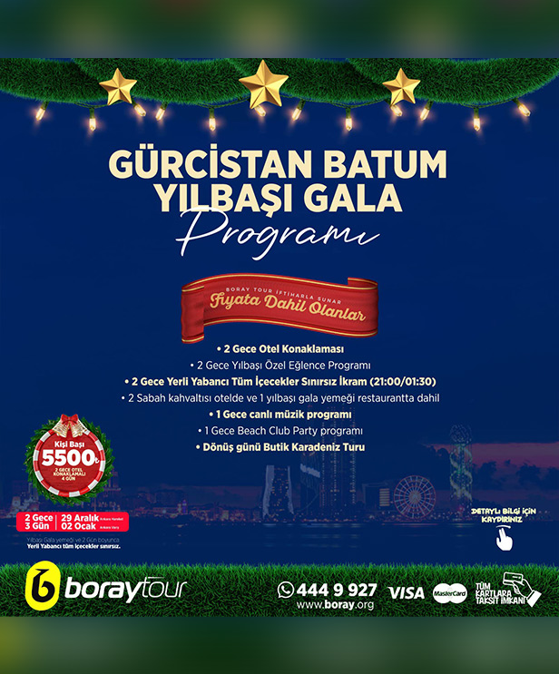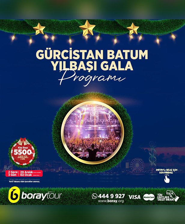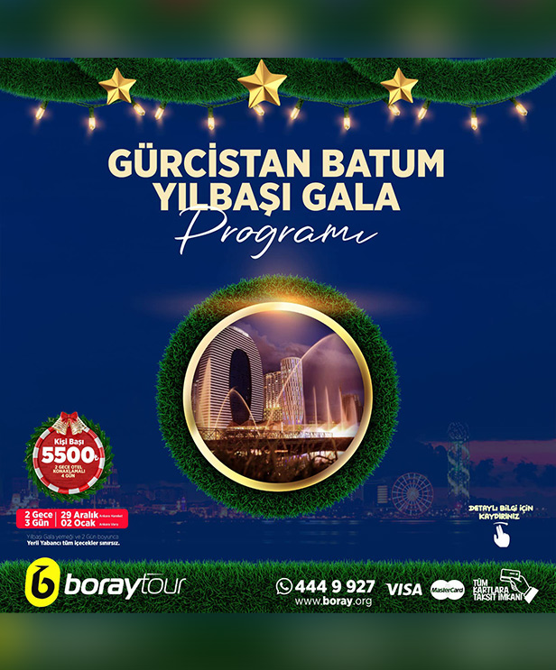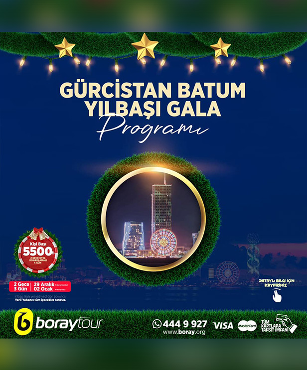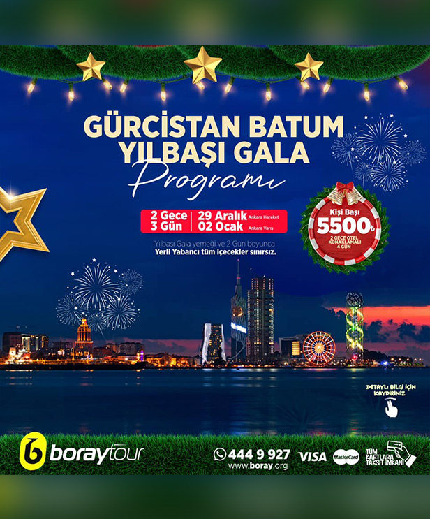 Batum’un muhteşem atmosferinde, 2024 yılbaşını karşılamak için sizi eşsiz bir deneyime davet ediyoruz. 2024 yılbaşı, Batum’da düzenleyeceğimiz özel programla dolu dolu geçecek! Renkli etkinlikler, benzersiz gösteriler, sürprizlerle dolu unutulmaz anlar ve coşku vaat ediyor. Batum’un büyüleyici manzaraları eşliğinde geçireceğiniz bu özel tur ile, 2024’e unutulmaz bir başlangıç yapmak için hazır olun! Ankara çıkışlı Batum turu ve yılbaşı eğlence programını kaçırmayın!