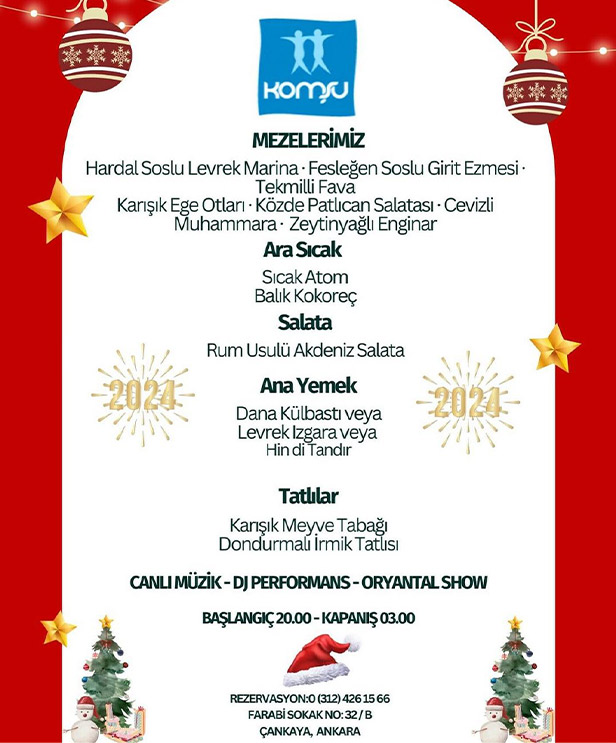 2024 yılbaşında Komşu Restoran’dayız… Ankara’nın keyifli ve lezzetli duraklarından Komşu Restaurant Farabi, muazzam bir programla 2024’e merhaba diyor. Canlı müzik, DJ performansı ve oryantal show ile dolu bu özel gece, sizlere unutulmaz anlar yaşatacak.