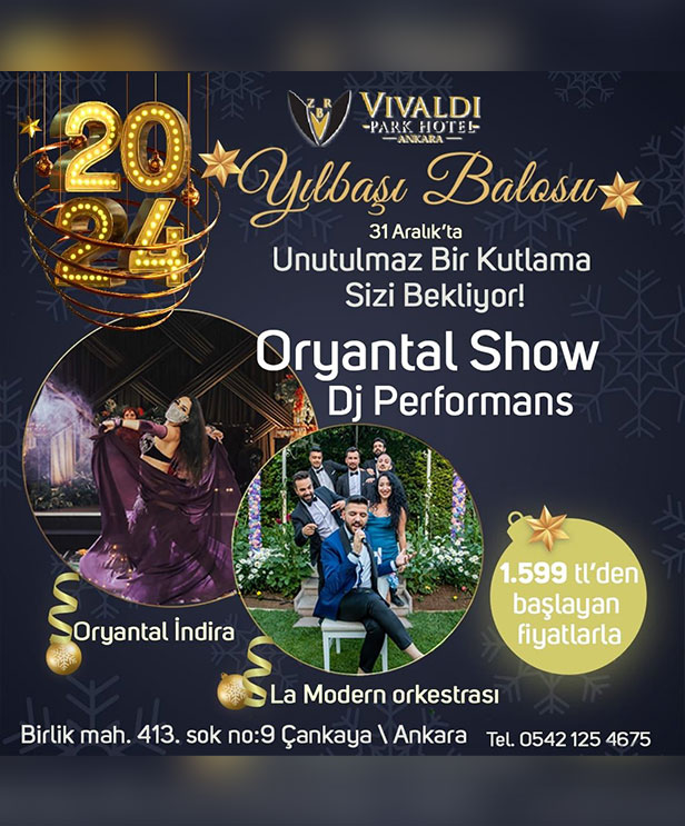 Ankara Vivaldi Park Otel bu yıl da 2024 yılbaşı gecesinde konuklarına bol müzik, bol eğlence ve sürprizlerle dolu bir gala programı sunmaya hazırlanıyor. 2024 yılbaşı gecesinde La Modern Orkestrası eşliğinde gerçekleşecek olan bu etkinlikte yerinizi şimdiden ayırtmak için acele edin.